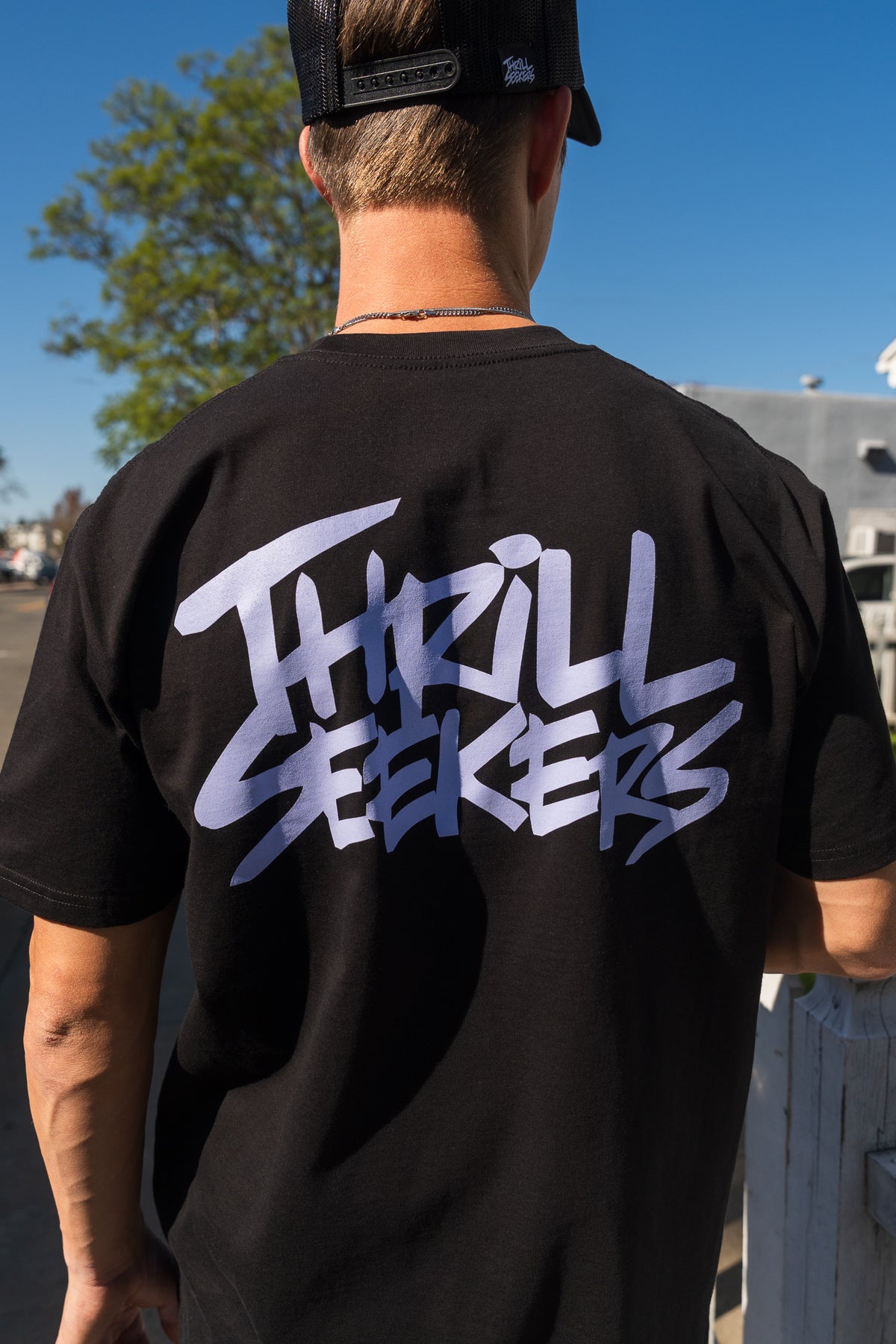 Thrill Seekers Classic Tee features an graphic logo printed in Lavender on the front and back of a black short sleeve mens t-shirt.