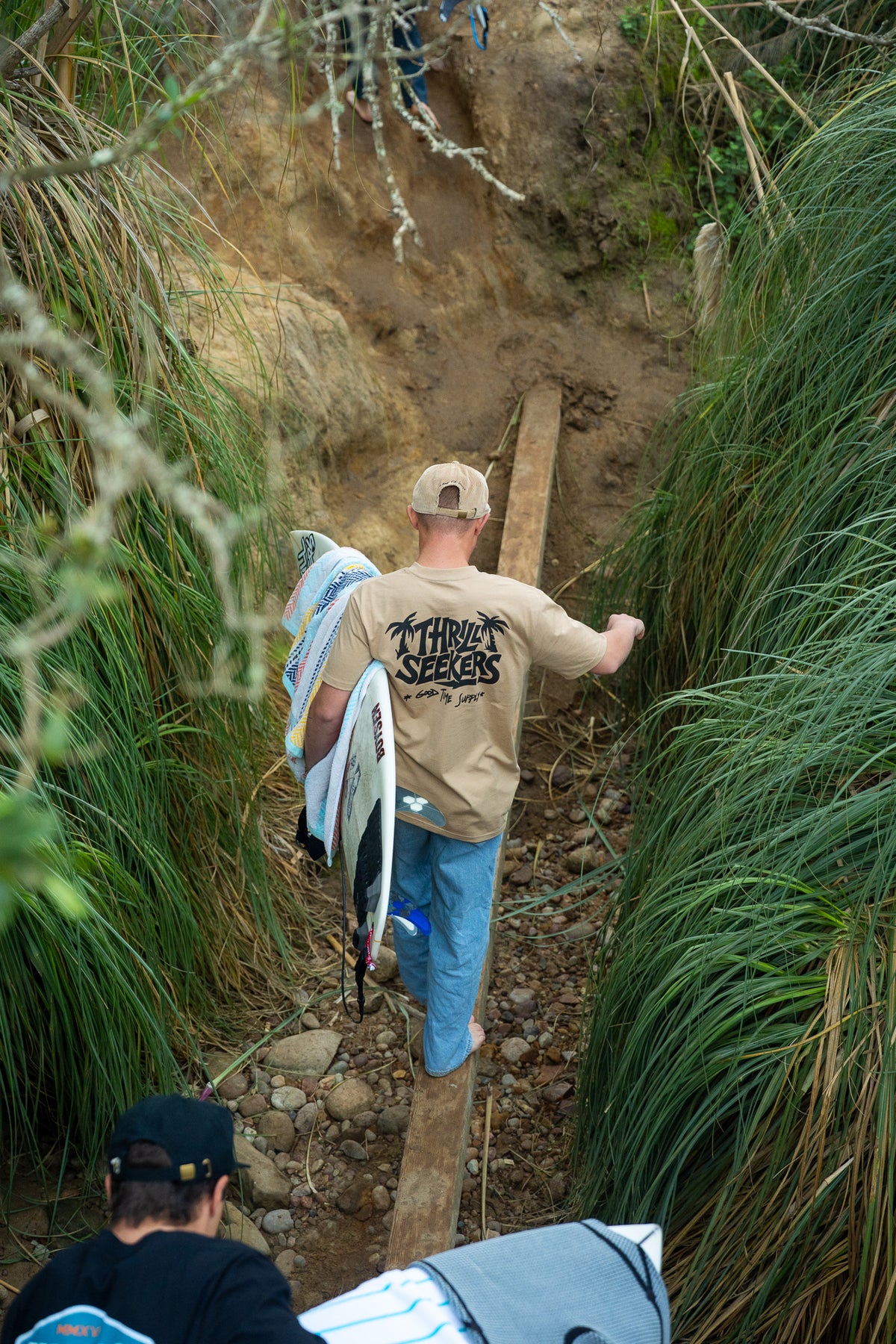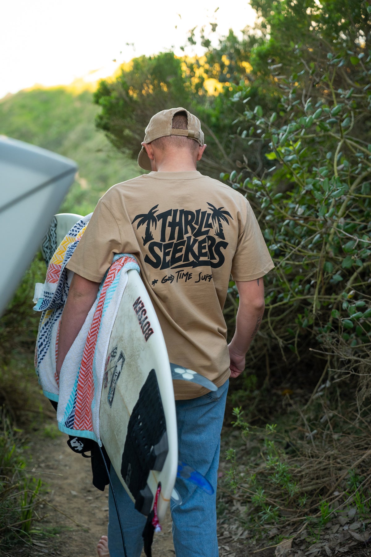 Thrill Seekers Good Time Supply Tee features a graphic logo printed on the front and back of a khaki short sleeve mens t-shirt.