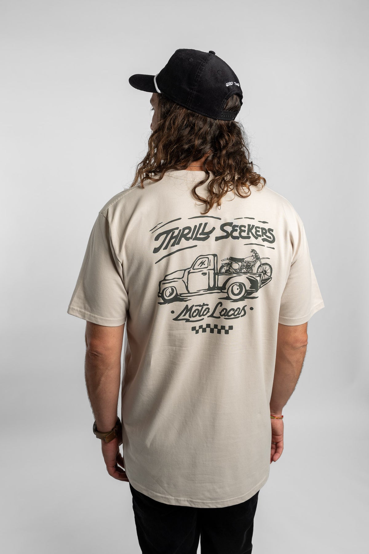Thrill Seekers Moto Locos Tee features a graphic logo printed on the front and back of a bone colored mens short sleeve heavyweight t-shirt.