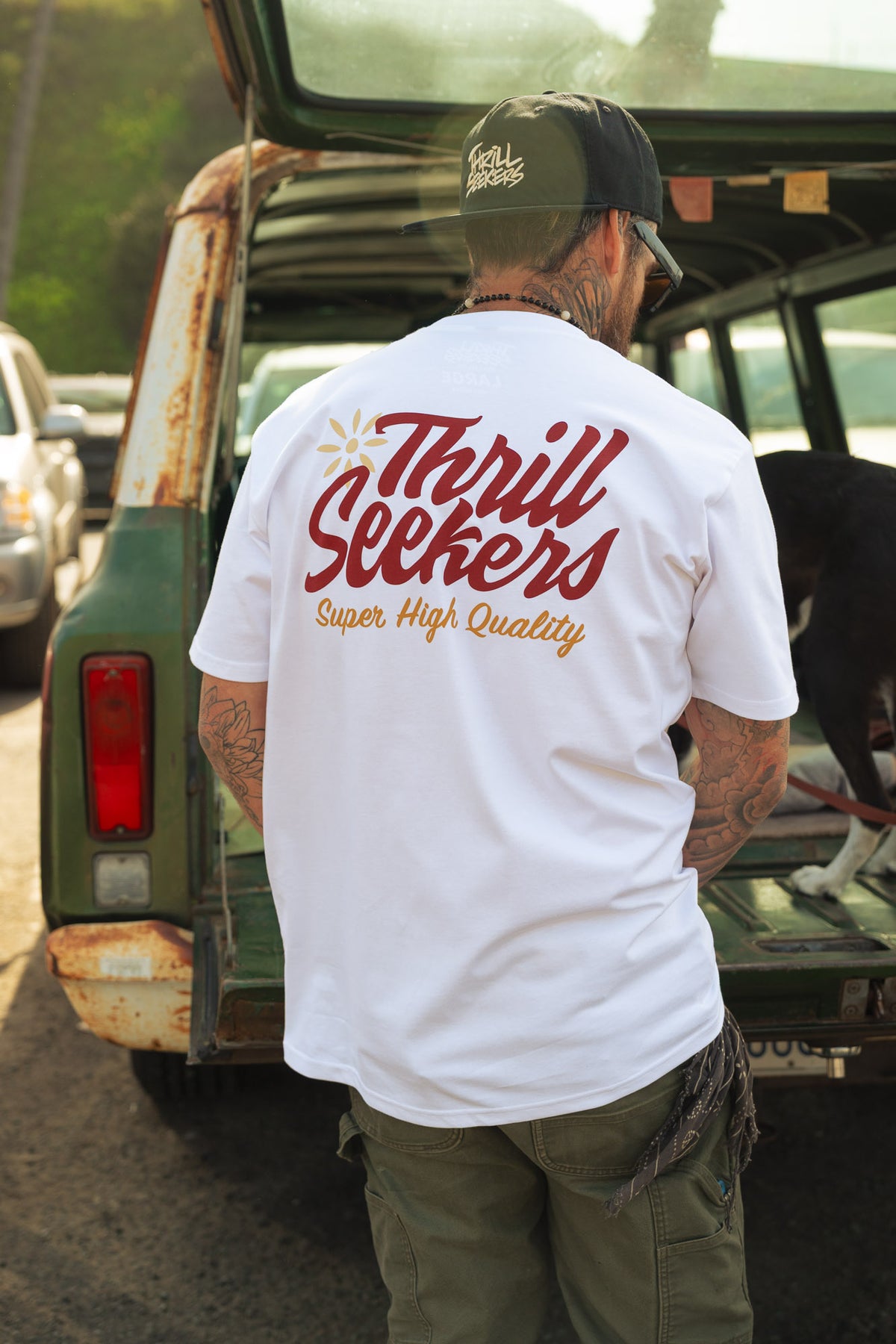 Thrill Seekers Painter Tee features a graphic logo printed on the front and back of a pearly white heavyweight short sleeve t-shirt.