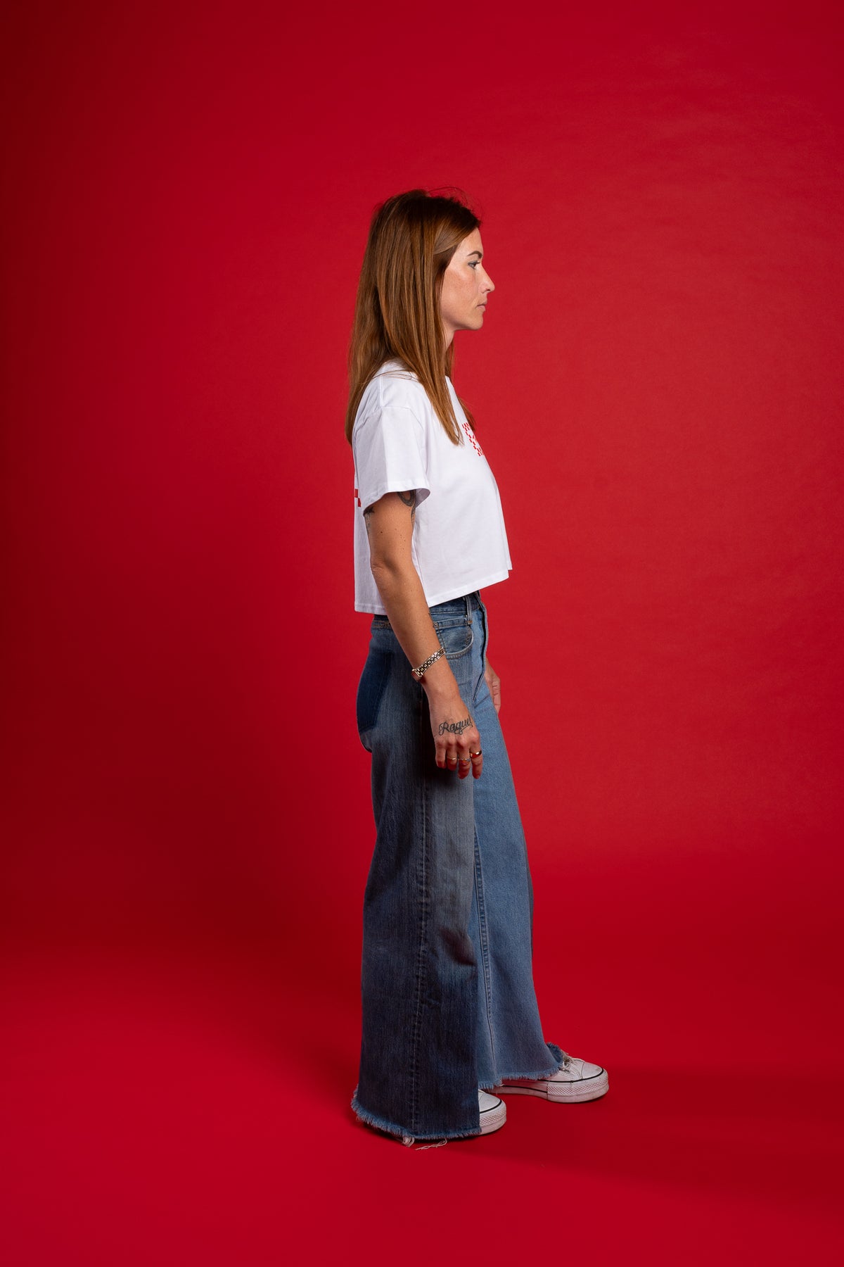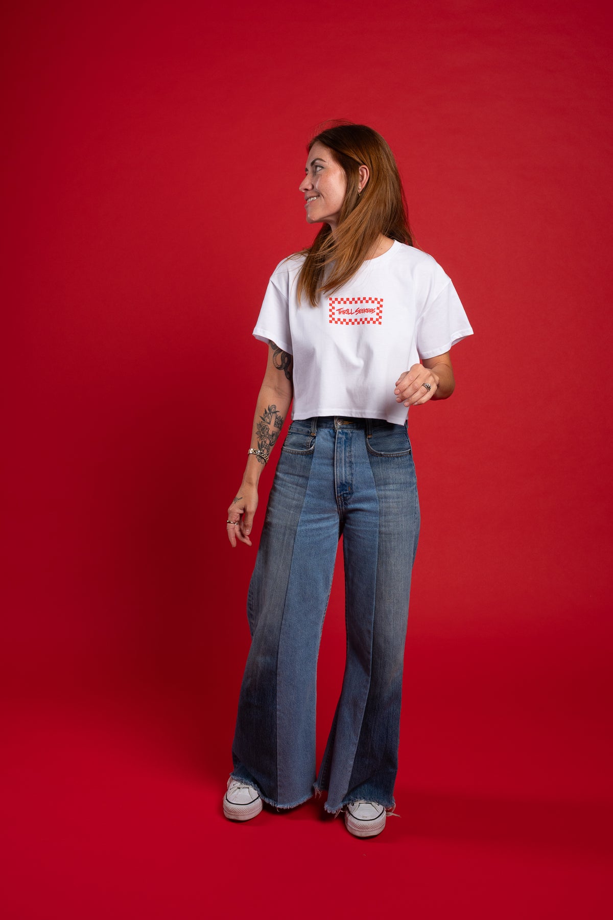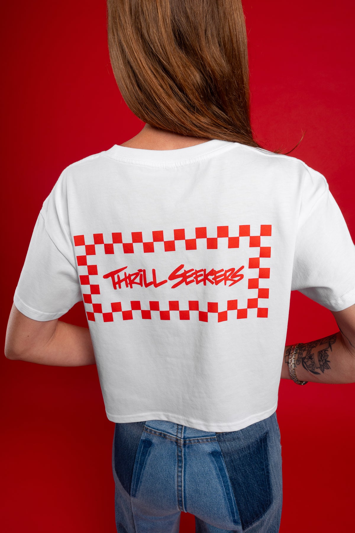This Babes Thrill Seekers Red/White Chex Crop features a graphic logo on the front and back of babes crop mid weight tee.