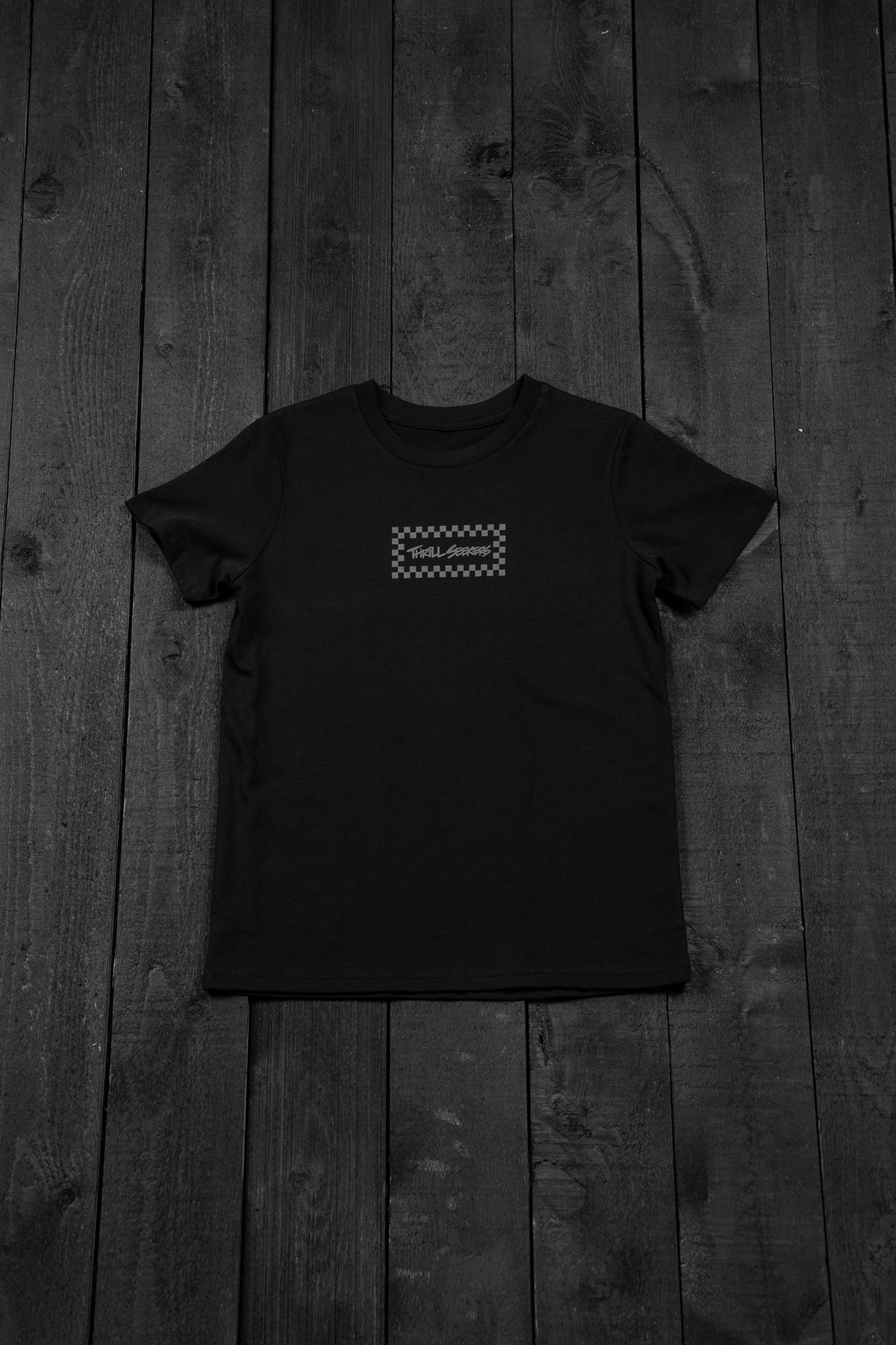 Thrill Seekers Kids Black/Grey Chex Tee features a graphic logo printed on the front and back of a premium short sleeve youth sized t-shirt.