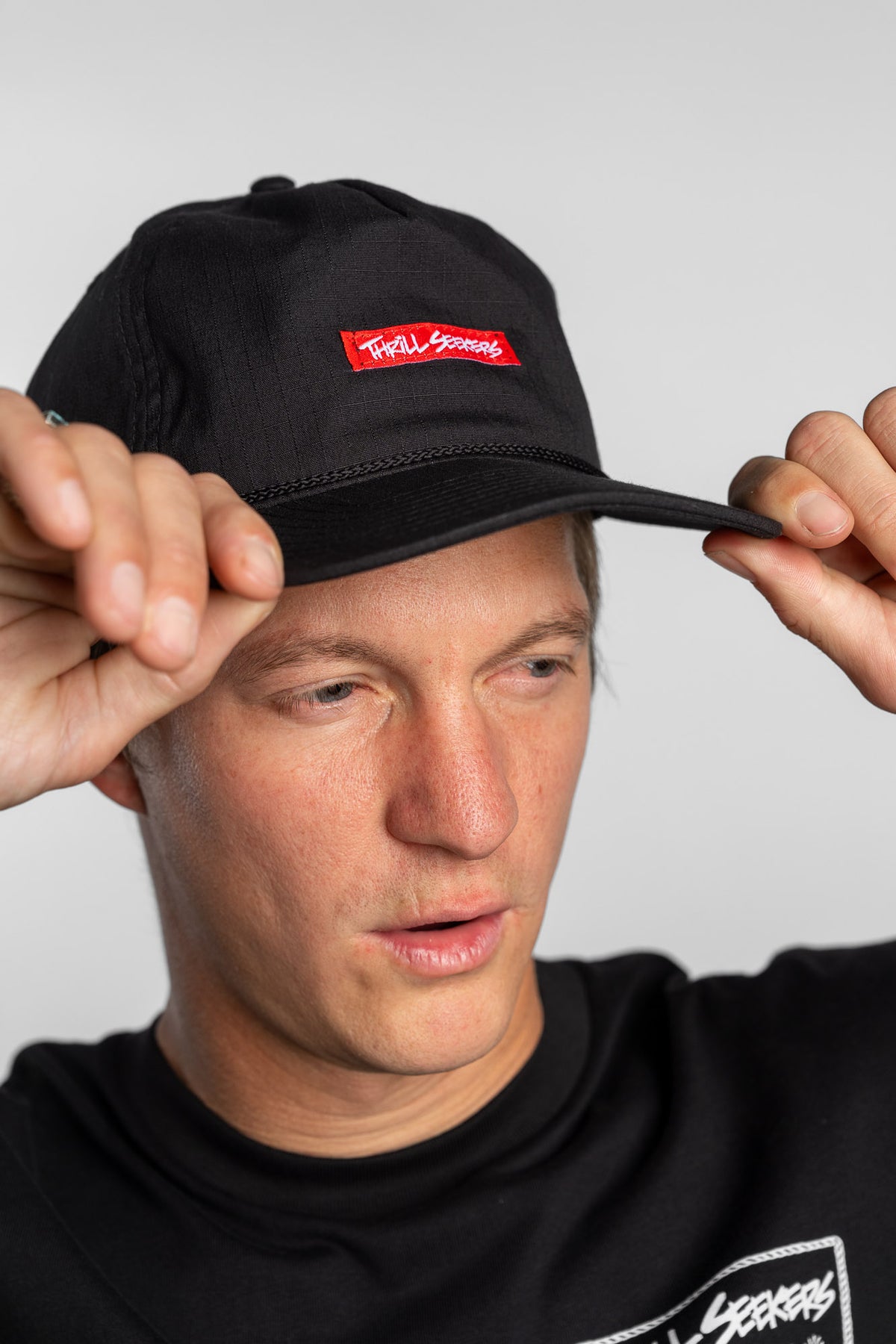 Thrill Seekers Red Label black roper cap with our signature red and white logo. Made with woven rip stop nylon. This is an unstructured mid profile adjustable fit with a snapback closure.