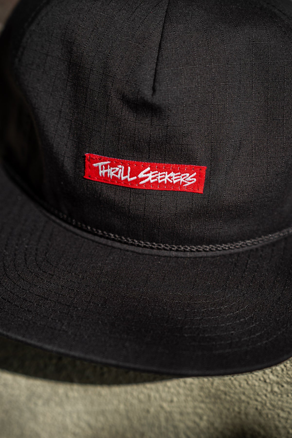 Thrill Seekers Red Label black roper cap with our signature red and white logo. Made with woven rip stop nylon. This is an unstructured mid profile adjustable fit with a snapback closure.