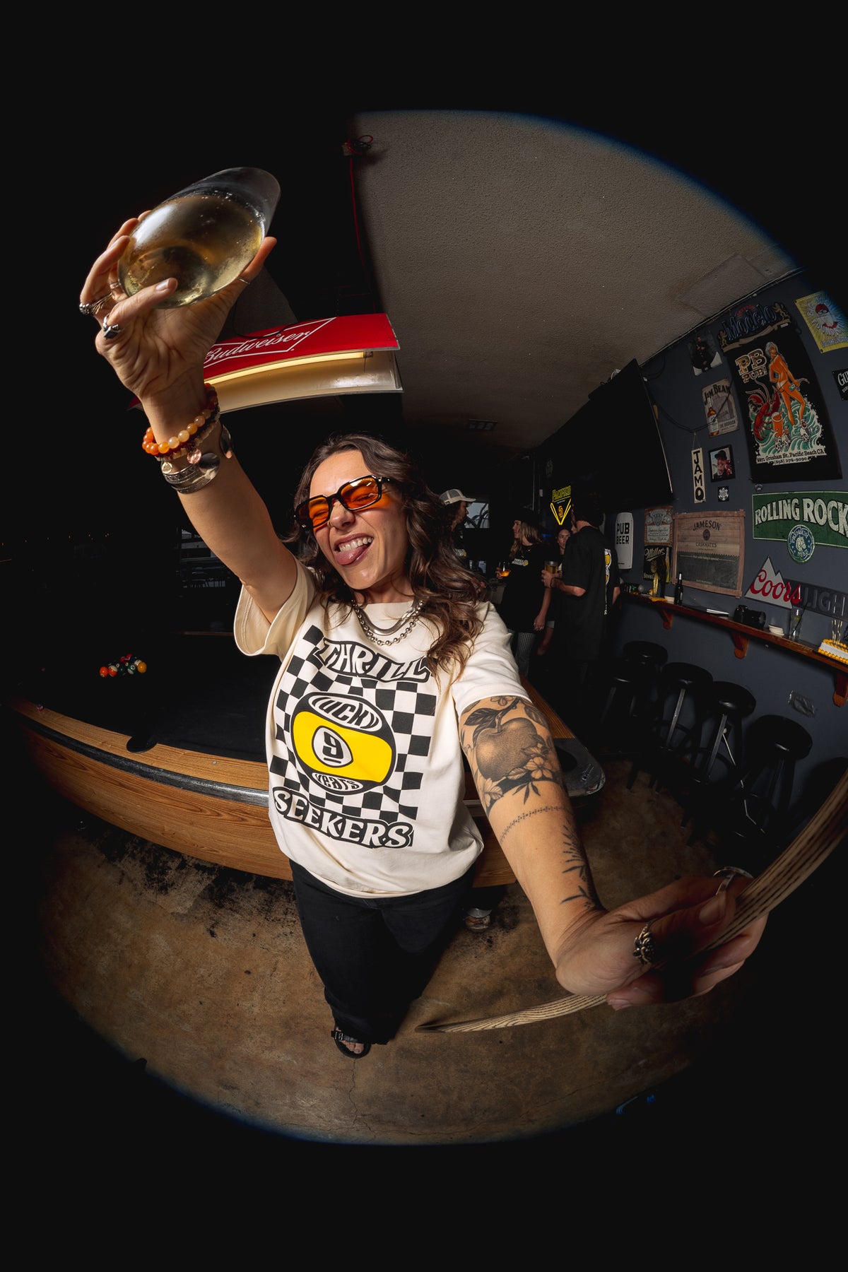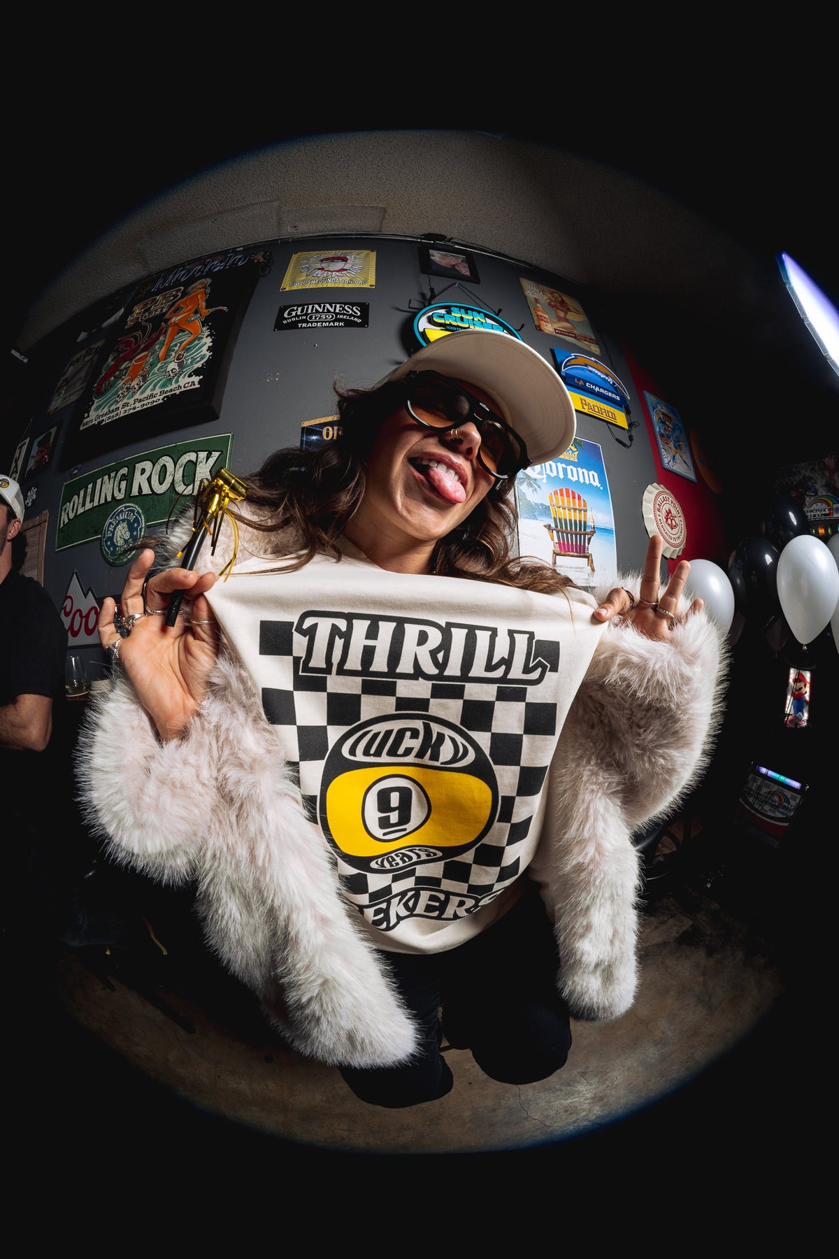 Celebrating nine years of Thrill Seekers with our Lucky 9 oversized babes t-shirt in a cream color. Made in small batch for a limited time.