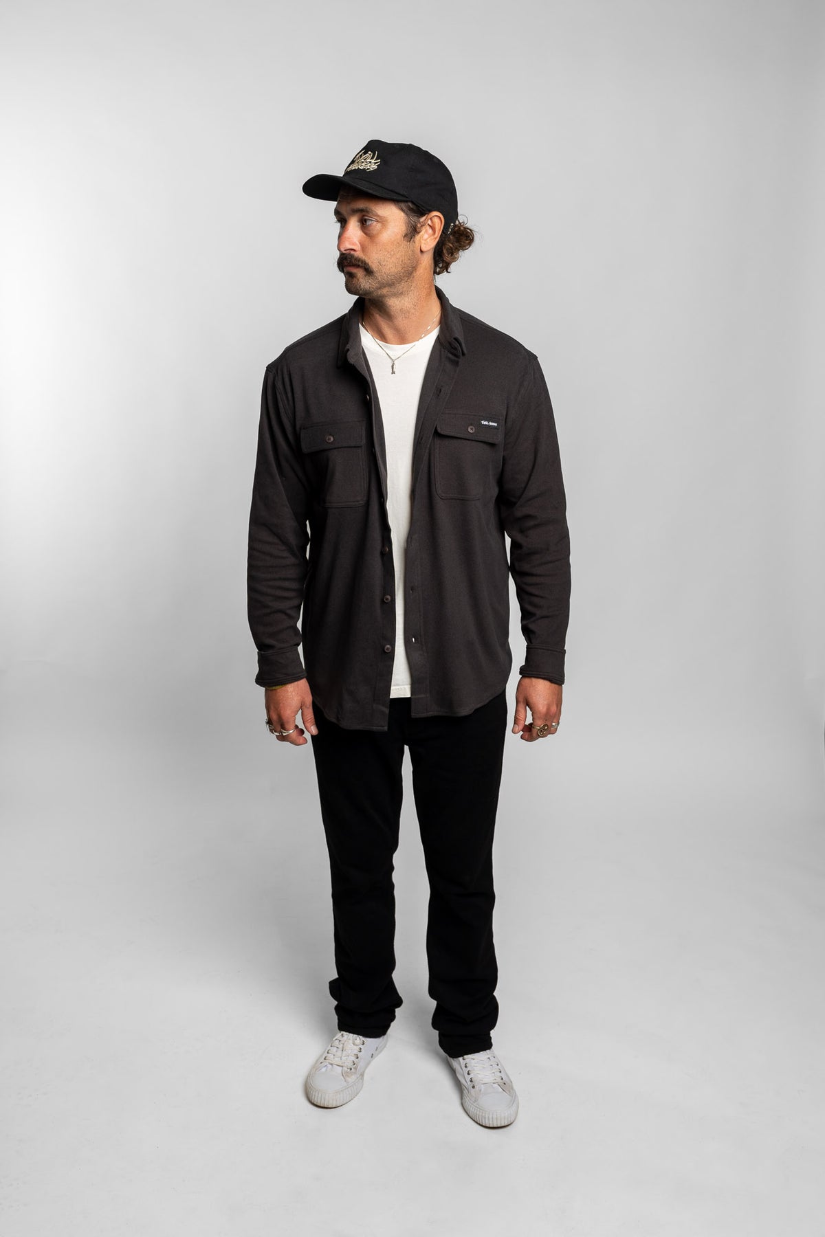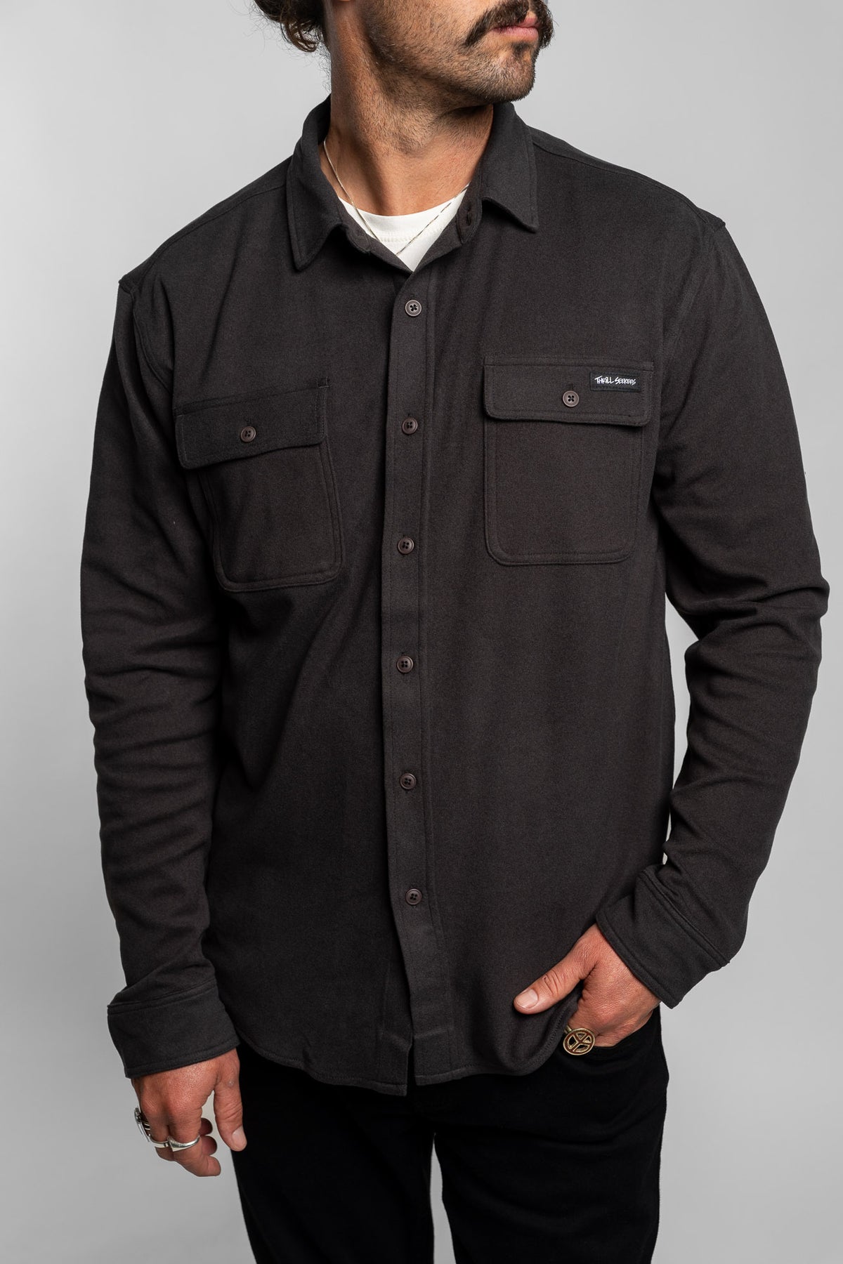 Keep the cold out and the style points up with this soft and lightweight two way stretch polar fleece button up in a dark charcoal color. Fits true to size, on the slimmer side. Austin is 5'11" wearing size Large for a proper fit.