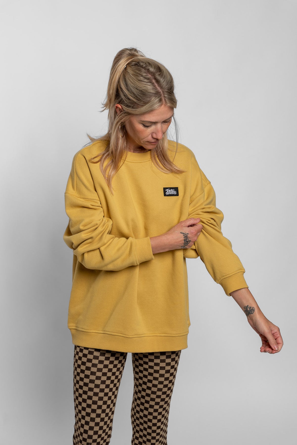 A lightweight and relaxed fit crewneck sweatshirt in a soft golden yellow. Size up for a more oversized look. Sasha is wearing size small.