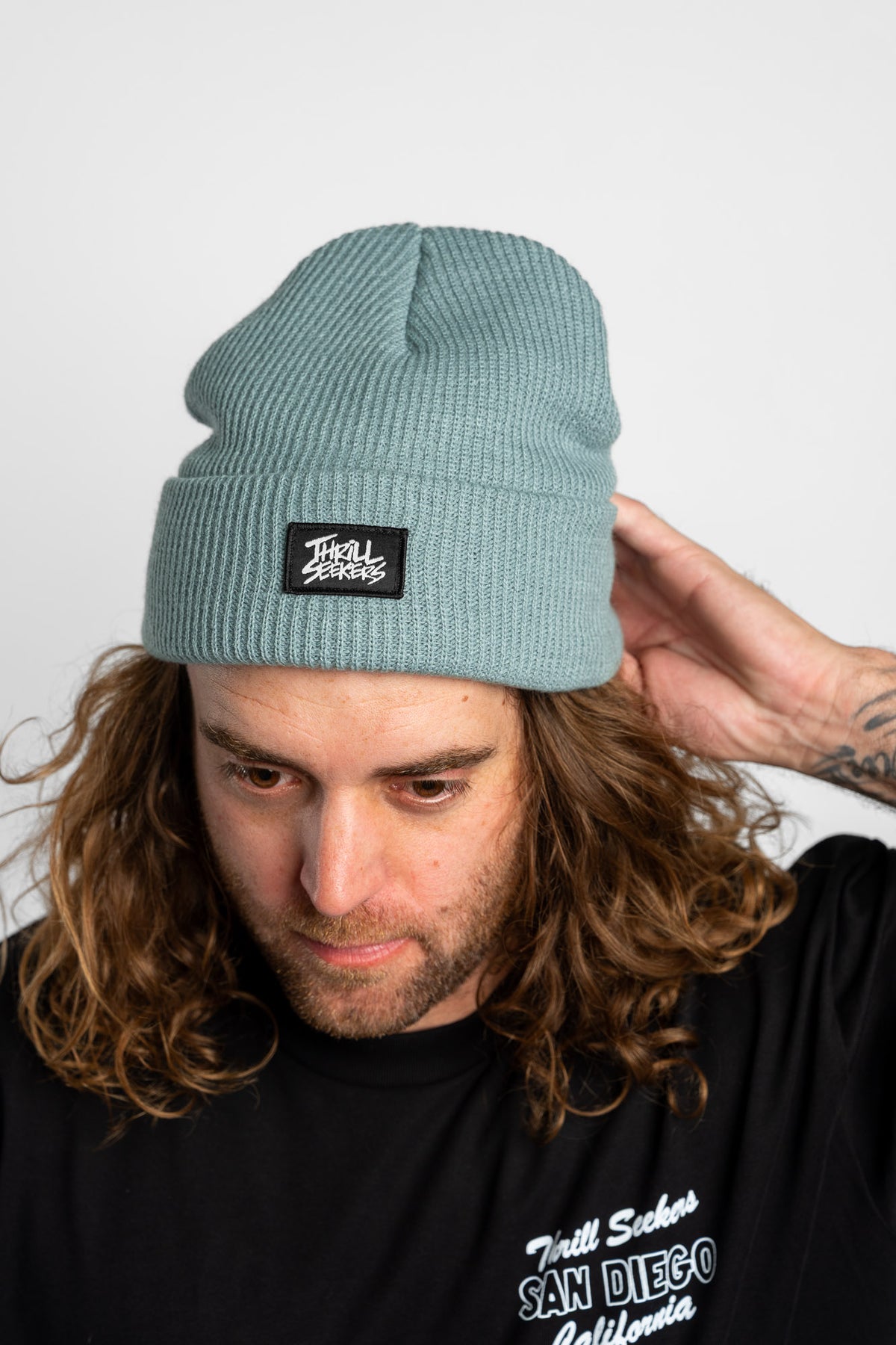 Thrill Seekers loose knitted cuff beanie with a black and white classic Thrill Seekers Classic label sewn in the center.