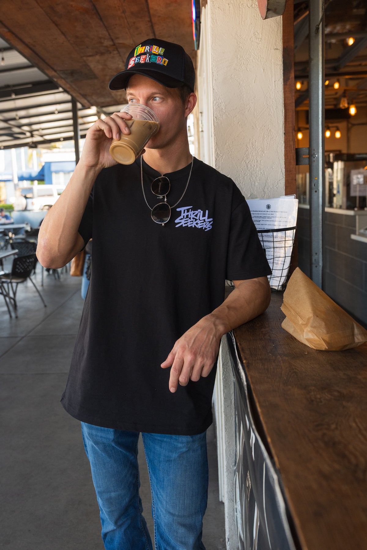 Thrill Seekers Mag Foam Trucker features a printed logo on the front panel of a premium black mesh back trucker style hat snapback hat.