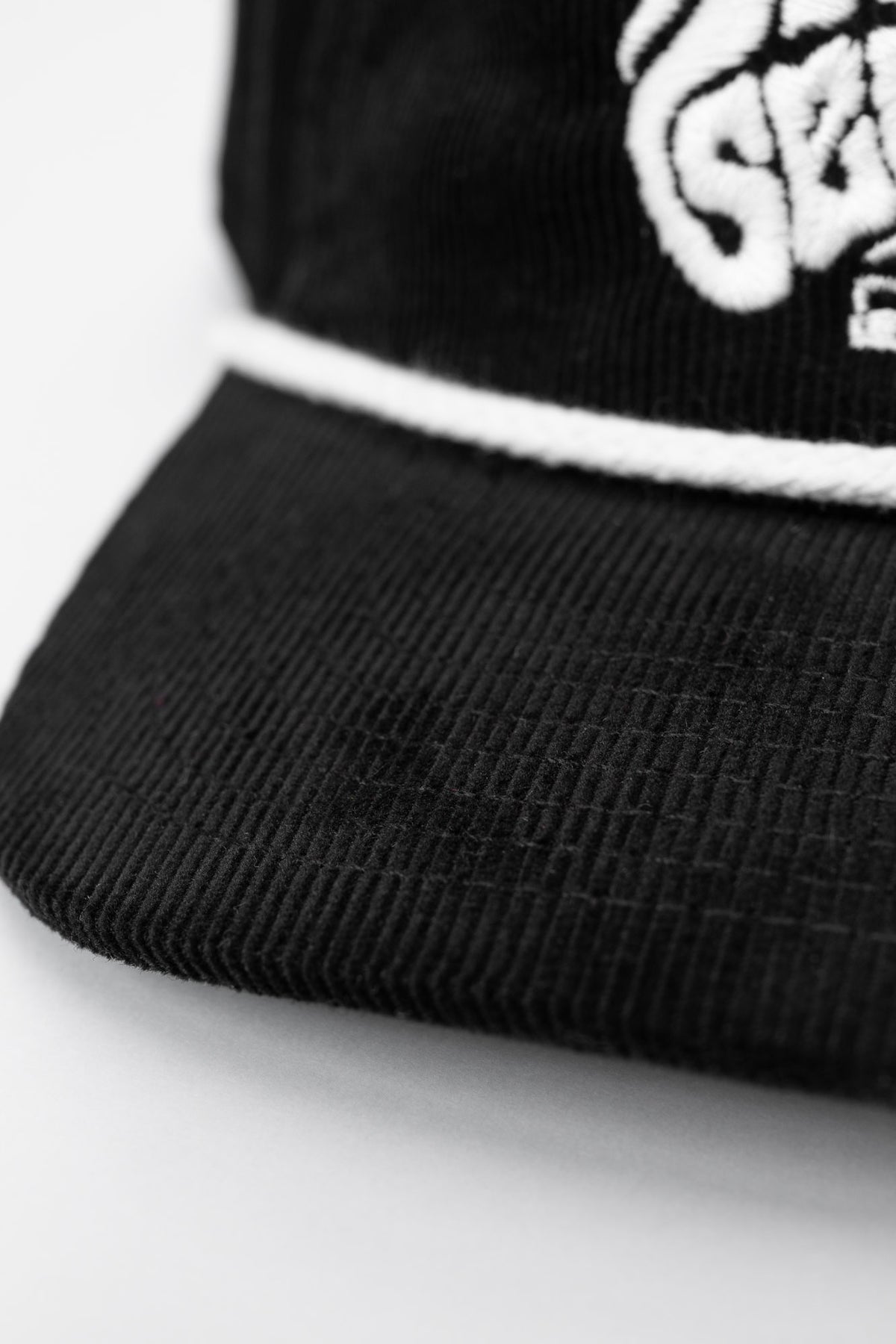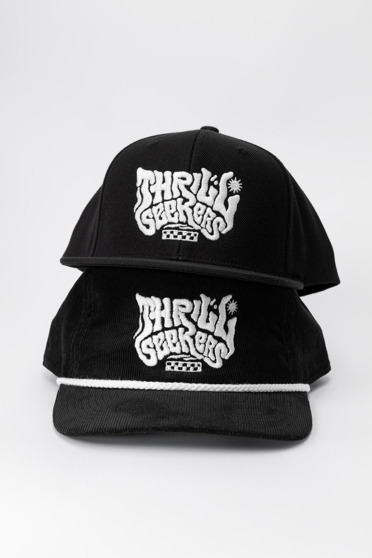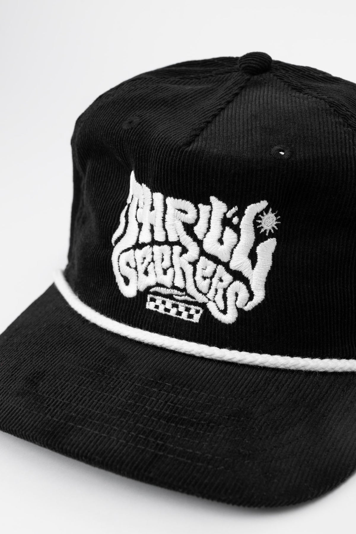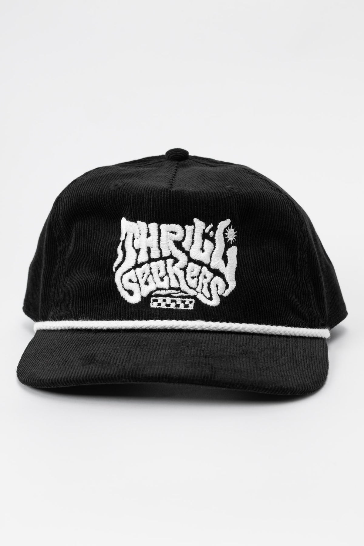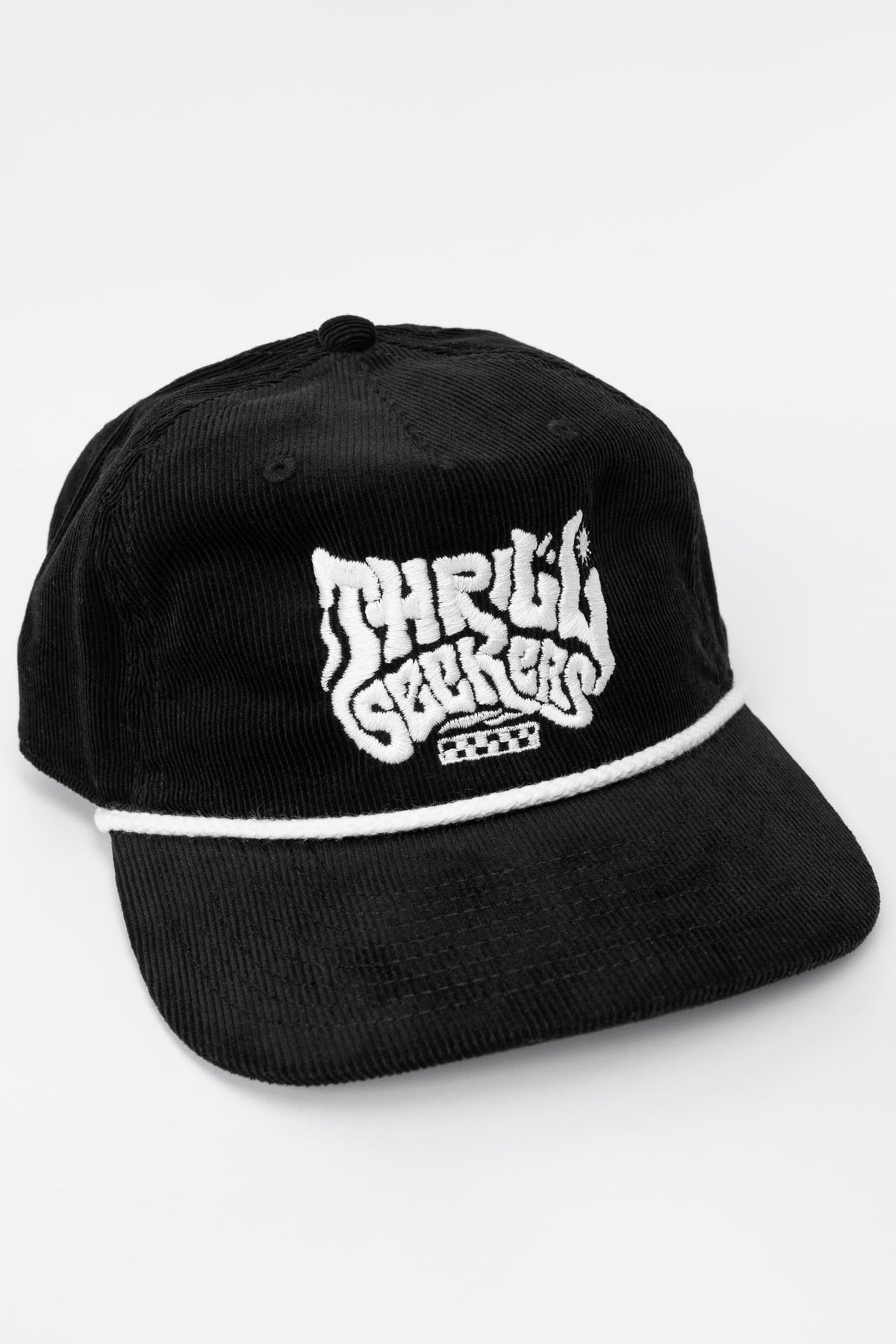 Thrill Seekers Smokin' Cord Hat features embroidered logos on the front panel and over the back arch of black corduroy snapback hat with a white contrasting rope. The relaxed semi-structure allows this hat to fit nicely on most head shapes n sizes.