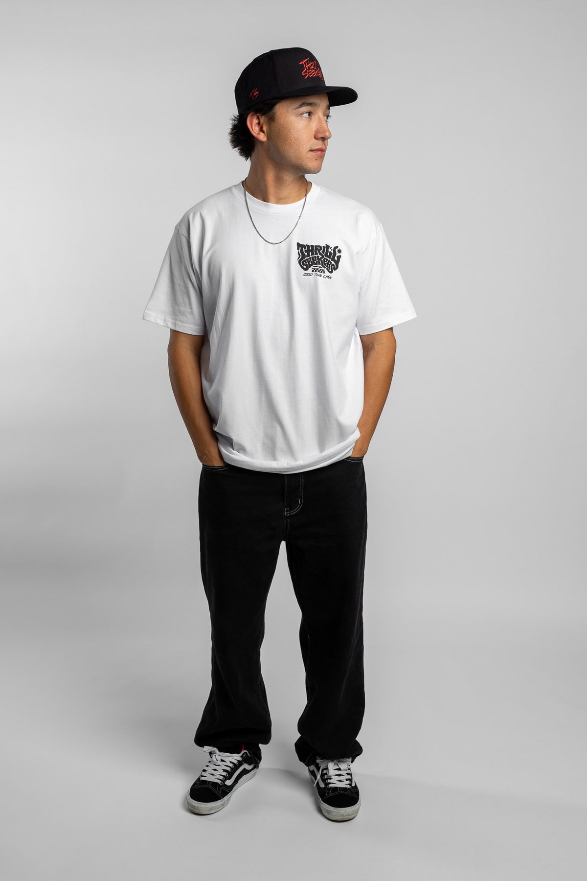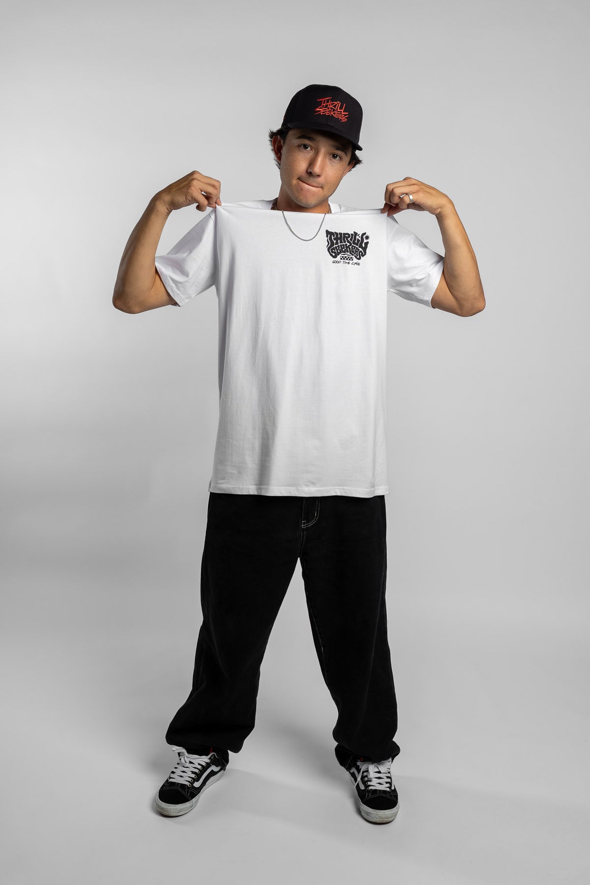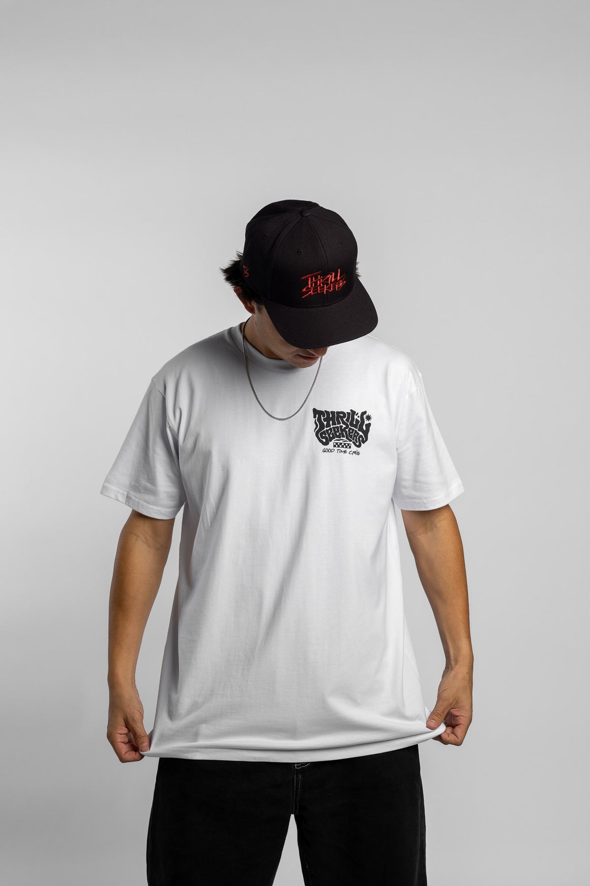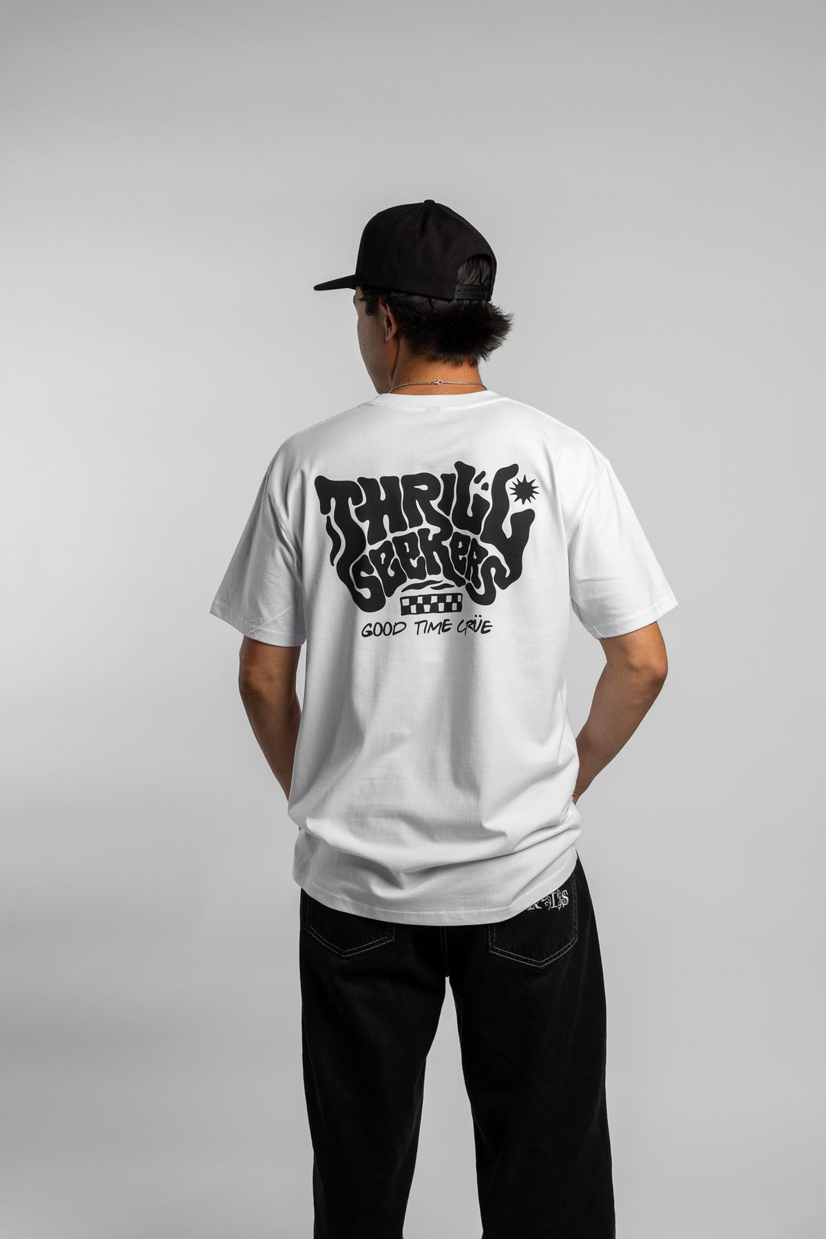 Thrill Seekers Smokin' Tee features a graphic logo printed on the front and back of a pearly white heavyweight short sleeve t-shirt.