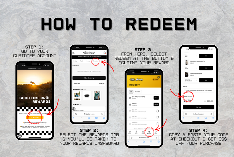 Good Time Crüe Rewards is our way of thanking you for hanging with us, supporting the brand and initiating you into the Crüe! It’s free to sign up & you’ll earn points as you shop that turn into $$$ off your next purchase.. Much love and thanks for being rad.